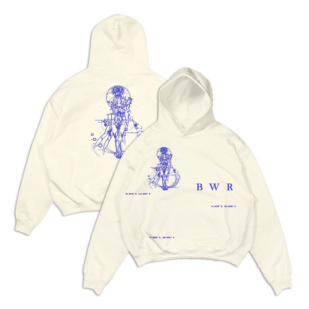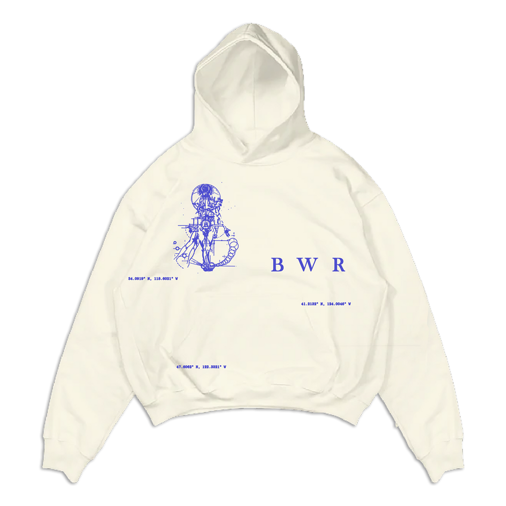 the kehlani ‘bwr pullover hoodie’ features blue water road designs printed on a cream unisex 80% ringspun cotton, 10% polyester, 10% recycled polyester hoodie.Share